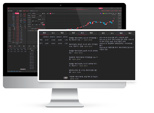 기존 HTS 및 포털에서 일일이 찾아보셔야 하는 정보들을 원클릭으로 한 눈에 볼 수 있게 재무, 뉴스, 재료 등을 정리해 두었습니다.